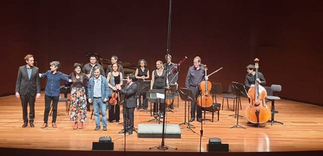 Saludos de los compositores presentes en el concierto, de izquierda a dcha. Giovanni Bertelli, Carlos de Castellarnau, Raquel Gacría-Tomás y Jorge Fernández Guerra.