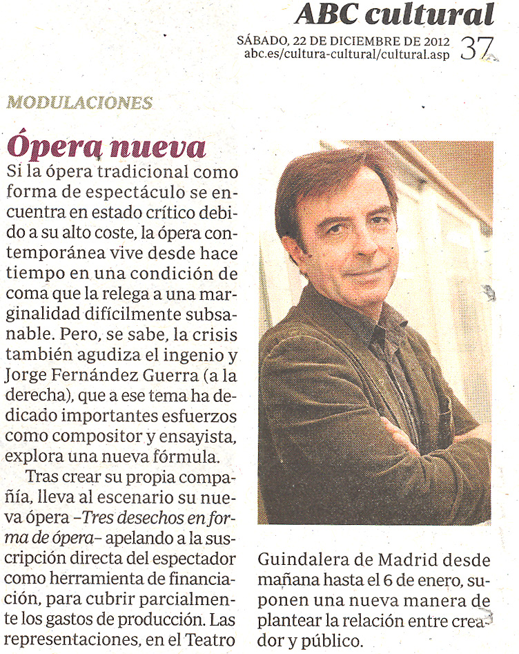Artículo sobre ‘Tres desechos en forma de ópera’, publicado en el suplemento cultural del periódico ABC, 22/12/2012 (ver aquí)